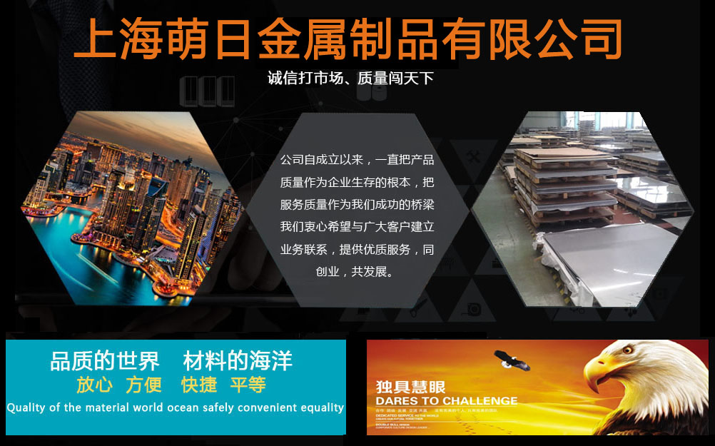 上海萌日金屬制品有限公司一直致力于為國(guó)內(nèi)各大中型國(guó)有企業(yè),外資企業(yè),民營(yíng)獨(dú)資企業(yè),模具制造企業(yè),機(jī)械加工企業(yè),石油化工企業(yè)及器械企業(yè)等供應(yīng)各種特種鋼材,進(jìn)口/國(guó)產(chǎn)鋁合金,不銹鋼,合金結(jié)構(gòu)鋼,42CrMo鋼板,35CrMo鋼板,40Cr鋼板,合金圓鋼,中厚板,鍛件,法蘭,鋼帶,軸承鋼,易切鋼,不銹圓鋼,合金管,矩形鋁管,無(wú)縫鋁管,鋁管,工業(yè)鋁管進(jìn)口及國(guó)產(chǎn)方胚/鋼錠/鋁錠,應(yīng)用于機(jī)械,機(jī)電,造船,工程,煤礦,紡織,電力,鍋爐, 汽車(chē)工業(yè)等各個(gè)領(lǐng)域。我公司可以根據(jù)客戶對(duì)特殊材料的要求進(jìn)行材料和產(chǎn)品的定制,可按ISO,ANSI,JIS,DIN,GB等標(biāo)準(zhǔn)定制,我們將本著"誠(chéng)實(shí)守信,合作共贏,長(zhǎng)期合作"的理念與新老客戶一起進(jìn)步發(fā)展。